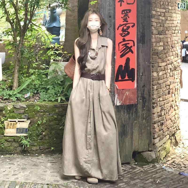 かわいい シャツワンピース レディース フランスの レトロ ノースリーブシャツ ドレス 女性用 夏 2025 ホット スタイル ウエストを 細くする の 作業着 ロング スカート