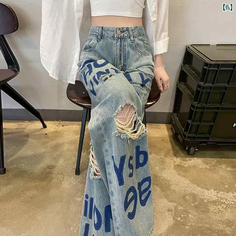 デニム ジーンズ レディース 2025夏用 薄手 破れ ジーンズ レター プリントの ストリート アメリカン ワイド レッグ ストレート パンツ