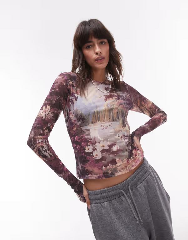 アンドアザーストーリーズ レディース トップス シャツ プリント メッシュ キャップ ケープ ジャージー & Other Stories mesh jersey long sleeve top withumbhole detail in landscape print LILAC ライラック