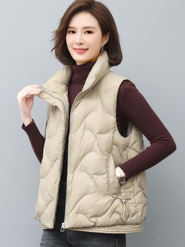 ・項目名: 厚さ・値: 中程度・項目名: 素材・値: ナイロン・項目名: 中綿・値: ホワイトダックダウン・項目名: 中綿の割合・値: 86%~90%・項目名: メイン素材・値: ナイロン・項目名: シルエット・値: ルーズ・項目名: 取り外し・値: 取り外し不可・項目名: 前立て・値: ジッパー・項目名: 襟・値: スタンドカラー・項目名: ファー・値: なし・項目名: デザイン・値: ポケット・項目名: 着丈・値: 普通(50cm<着丈≤65cm)・項目名: カラー・値: オフホワイト, ダークブラウン・項目名: サイズ・値: M, L, XL, XXL, XXXL・項目名: スタイル・値: 通勤・項目名: 対象年齢・値: 成人・項目名: 服装スタイル・値: 大きいサイズ・項目名: 対象・値: 女性・項目名: 製品カテゴリ・値: ダウンベスト
