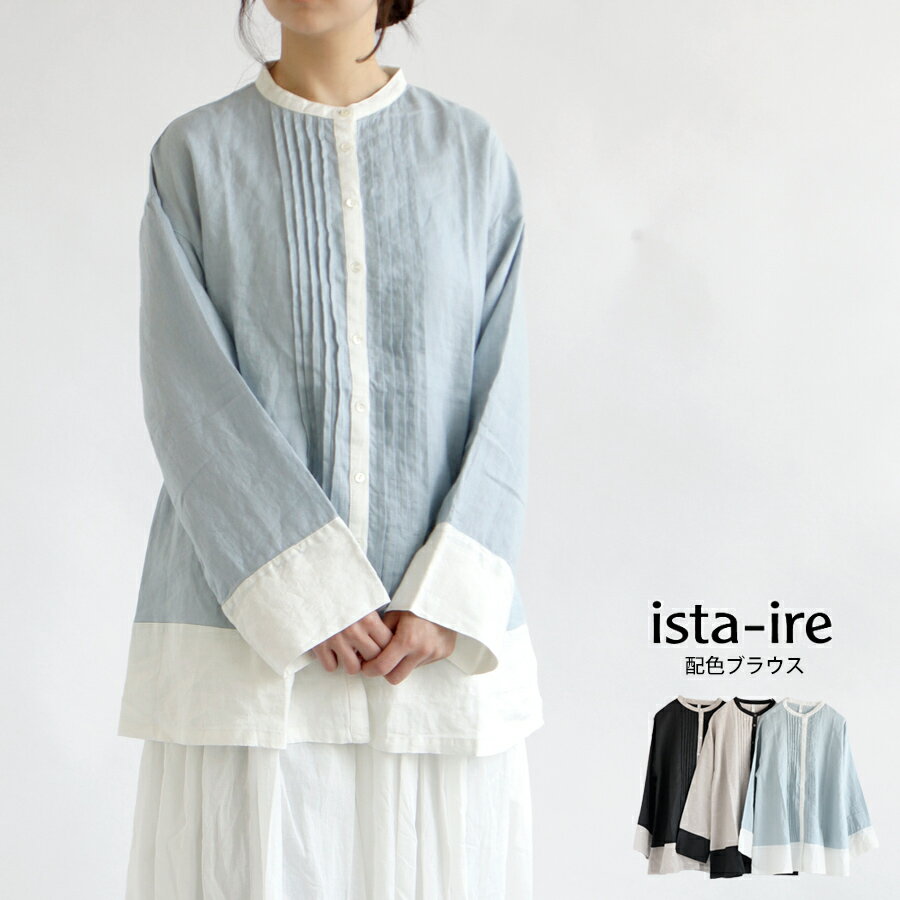 【最大100%ポイントバック】【送料無料】 ista-ire 平織リネン 配色 ブラウス 春 夏 秋 トップス ピンタック 麻100% スタンドカラー ウィザード・スリーブ イスタイーレ 26-4600-3500