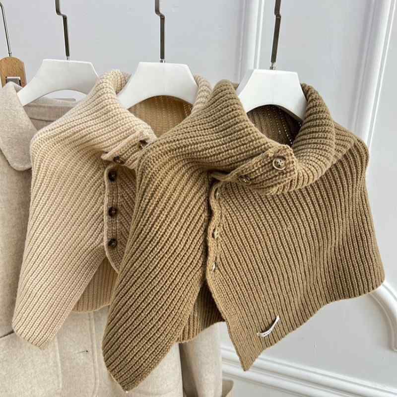 ニット レディース 韓国ファッション タートルネック スリット ショール ポンチョ プルオーバー ボタン付き コットン 羽織り ネックウォーマー 防寒 着回し 秋冬