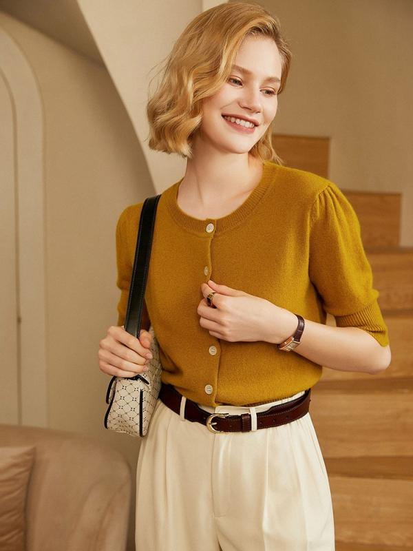 カーディガン レディース 薄手 ニット 7分袖 ショート丈 ウール 秋冬 高見え きれいめ エレガント 通勤 オフィス シャンパン キャメル ホワイト イエロー(x2)