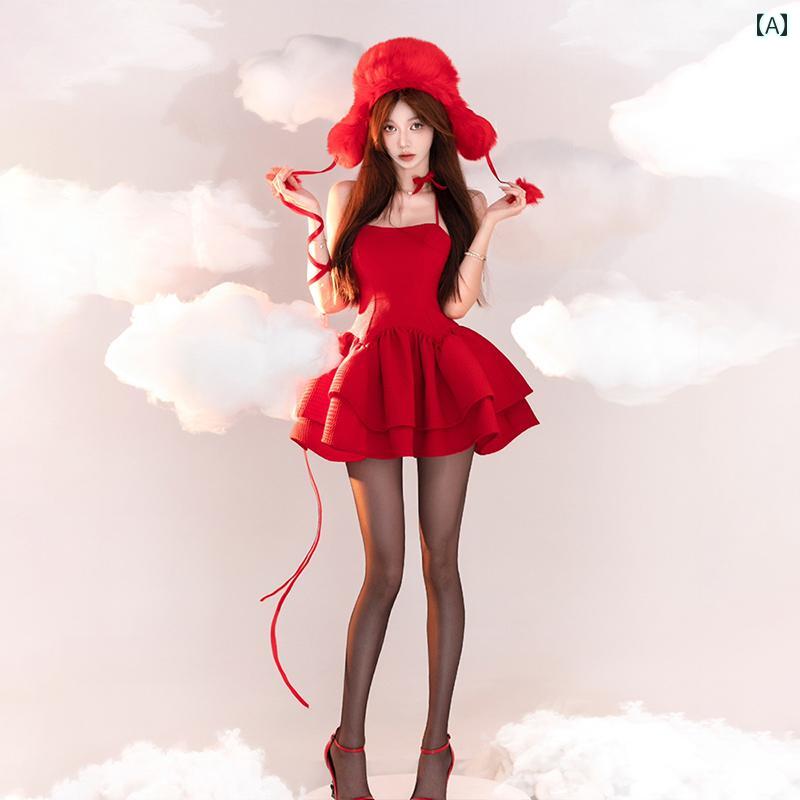リゾート ワンピース 大人 レディース 赤い サスペンダー ドレス ニュー イヤー シャツ 秋冬 バースデー ドレス プリンセス ドレス ふくらみ ショート スカート