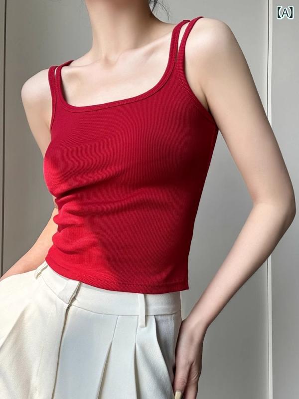 キャミソール レッド ノースリーブニット ベスト 女性の 夏の 2024 新しい ダブル ショルダーストラップ スリムフィット 多 用途 シックな トップ