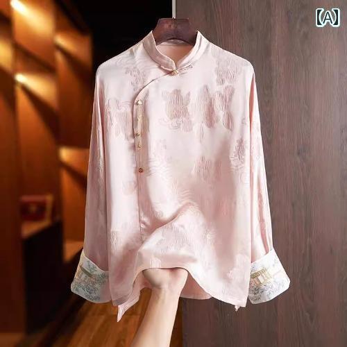 レディース トップス Tシャツ チャイナ風 シルクシャツ レディース 長袖 ボタン シャツ 杭 州 高級 サテン 桑 シルク トップ