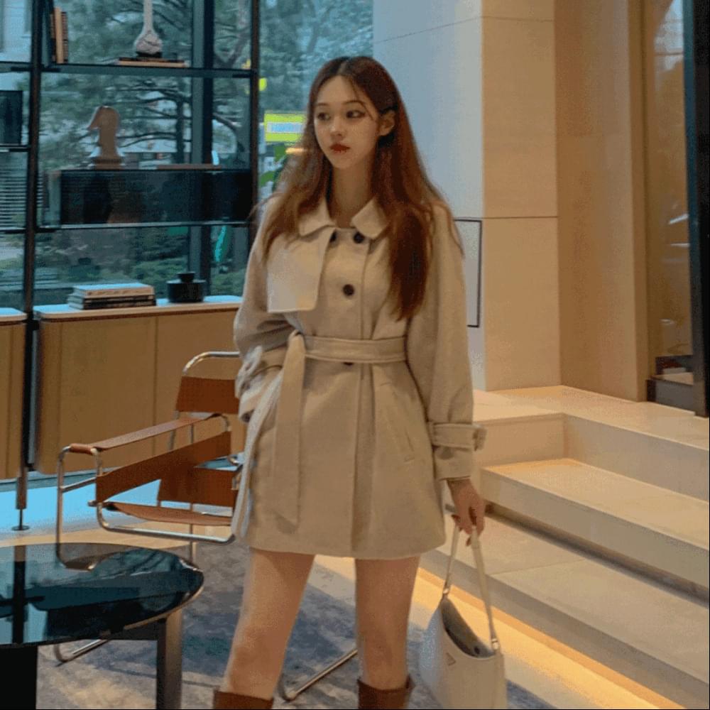 ベルトSETドトムAラインワンピース型ルーズフィットダブルボタンカラーベルトケープハーフコートワンピースジャケットウールショートトレンチコートオートミール栗色 コート トレンチコート レディース|韓国 wannabemuse|コーディブック