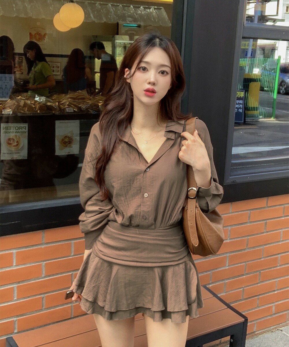 カラーシャツシャーリングスモークバンディングフレアミニワンピース長袖ブラウス ミニワンピース レディース|韓国 wannabemuse|コーディブック