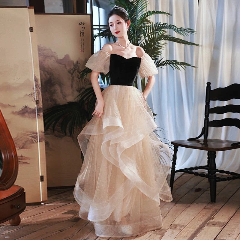 XXXL XXL XL L M S XS Aライン 二次会ドレス 結婚式ドレス ロングドレス チュール袖 パフスリーブ 肩出し オフショルダー