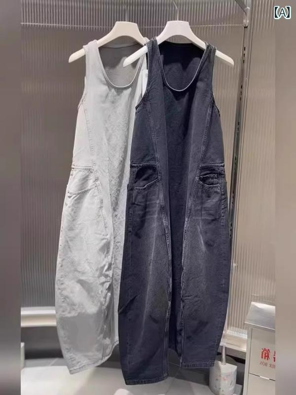 ジャンパースカート レディース 大きいサイズ ぽっちゃりさん向け デニム ワークカジュアル おしゃれ 万能 着回し サロペットスカート ロング丈 Hライン ノースリーブ ワンピース 夏 白 黒
