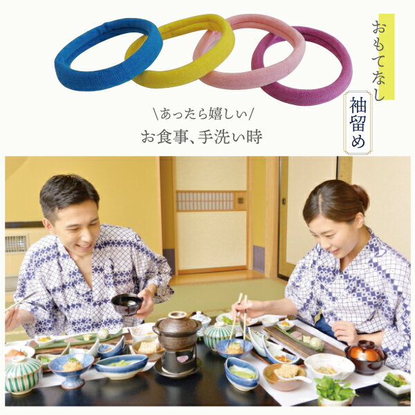 商品説明 袖留め(ゴム) ■ サイズ 外径約75mm ■ カラー 4色アソート(ブルー、イエロー、パープル、ピンク) ■ 主な素材 ポリエステル100% ■内容量 1000個(125個×2×4色)浴衣のお袖の気になるもたつきを袖留めで解消! お客様が浴衣の袖を汚さないように気をつけたりするシーンがあります。 ・お食事の時 ・朝に顔を洗う時 ・お化粧をする時 など 浴衣用の袖留めを使うことでお客様に袖を気にすることなく気持ちよく過ごしていただけます。 旅館・ホテル様の浴衣を着て作業するスタッフの方も作業する時など便利なアイテムとなっております。 優しい留め心地なので、締付けがきつく痛くなることもありません。 袖留めは、4色(パープル・ピンク・イエロ・ブルー)になっています。 袖留めのサイズは、外径は約75mmで柔らかな肌触りになっております。 使い勝手もよいのでアメニティの一つとしてオススメです。
