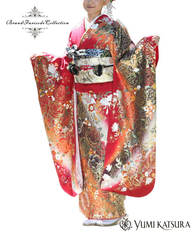 〈桂 由美 振袖〉〔成人式 振袖〕振袖レンタル01062 薔薇金彩モダン花刺繍ゴールド美振袖レンタル 〔レンタル 振袖〕〔成人式〕〔フルセット〕【往復送料無料】【振袖 赤色系】【女性和服】【振り袖】【着物レンタル】【レンタル】【t】