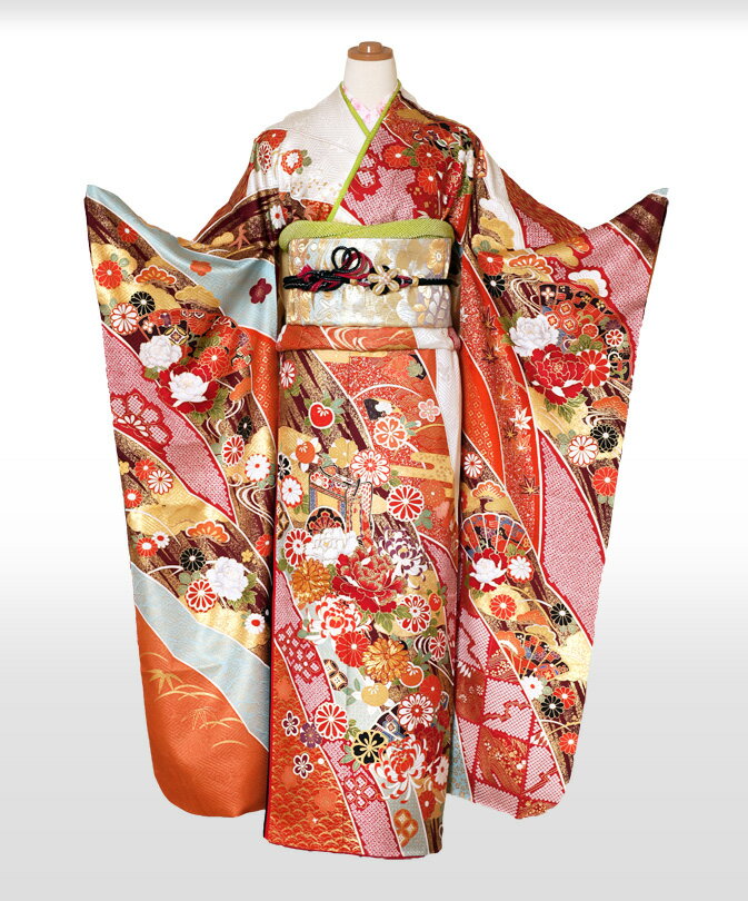 桂 由美 振袖〔成人式 振袖〕振袖レンタル01053 金彩モダン花蝶ゴールド華振袖フルセット振袖レンタル 〔レンタル 振袖〕〔成人式〕〔フルセット〕【往復送料無料】【振袖 赤系】【女性和服】【振り袖】【着物レンタル】【レンタル】【o】