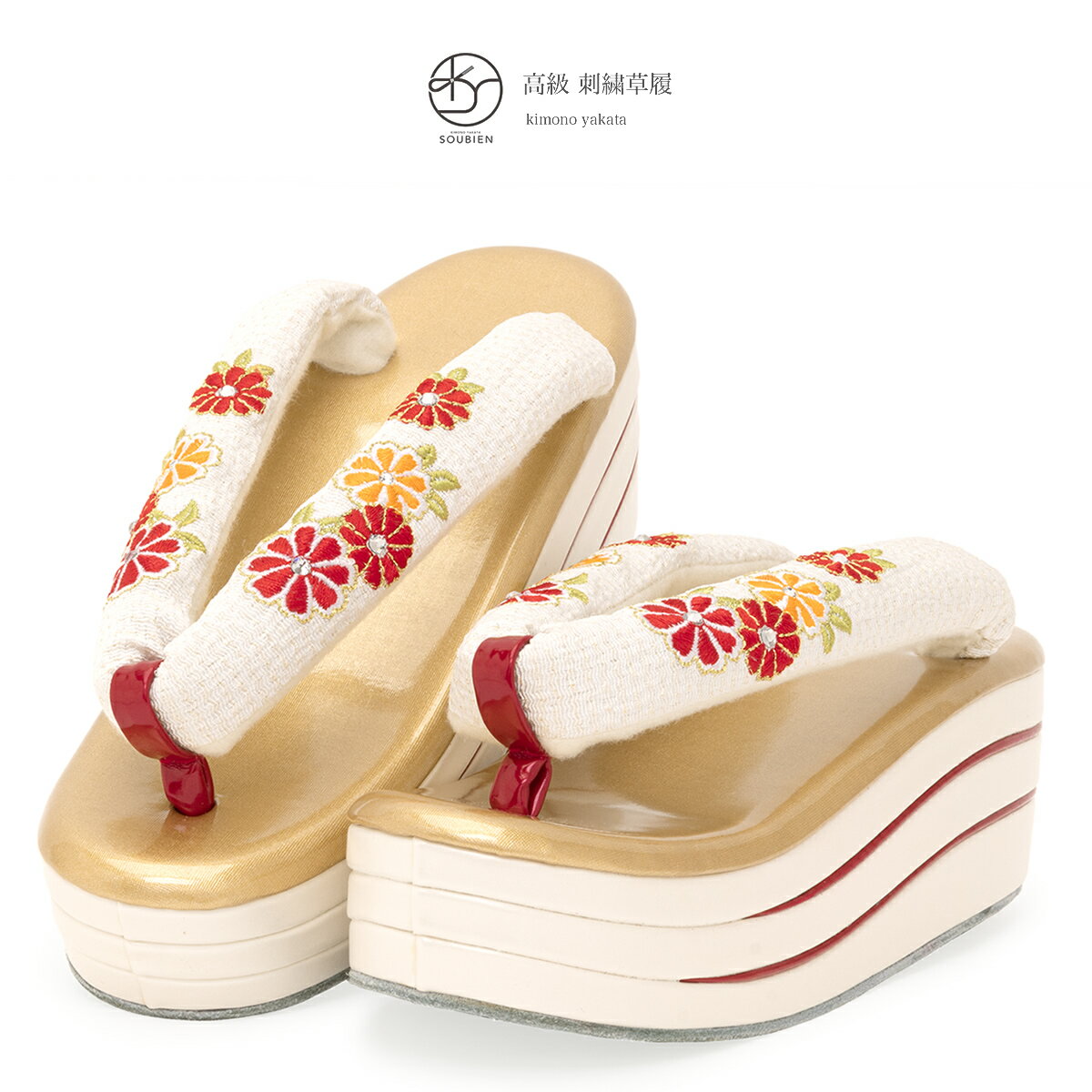 Black Friday☆最大1000円クーポン配布中☆草履 厚底 振袖 成人式 卒業式 袴 レディース 卒業式 ぞうり 盛装 yumiyumi 白 金 菊 キク 刺繍 ラメ ラインストーン 三枚芯 縮緬 クッション 桂由美 KATSURA YUMI フリー 送料無料