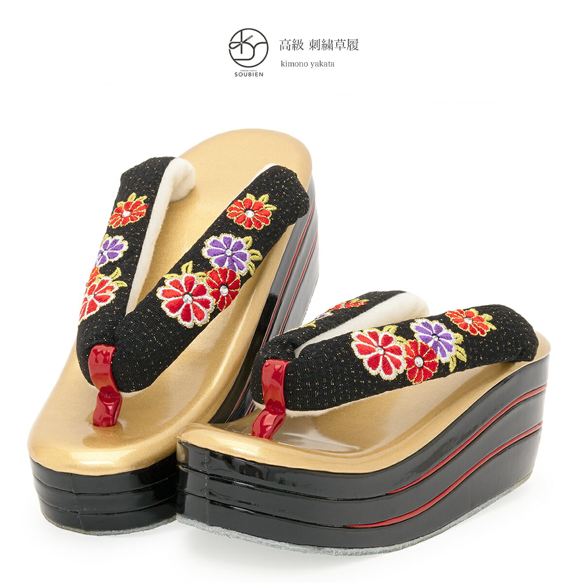Black Friday☆最大1000円クーポン配布中☆草履 厚底 振袖 成人式 卒業式 袴 レディース 卒業式 ぞうり 盛装 yumiyumi 黒 金 菊 キク 刺繍 ラメ ラインストーン 三枚芯 縮緬 クッション 桂由美 KATSURA YUMI フリー 送料無料