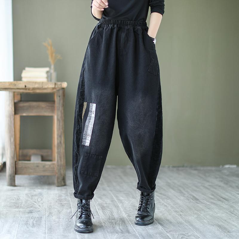 楽ちん ゆったり パンツ レディース 女性 春秋 ウエストゴム キャロット ハーレム カジュアル 普段使い デニム レトロ 黒 ウォッシュ 加工 ポケット