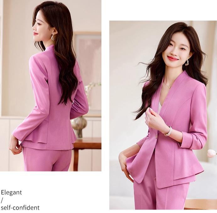 レディース パンツスーツ セットアップ 2点 上着 ピンク 水色 黒 ジャケット ノーカラー Vネック ウエストスリム フレア デザイン性 上品 エレガント ラグジュアリー モダン フォーマル 高級感