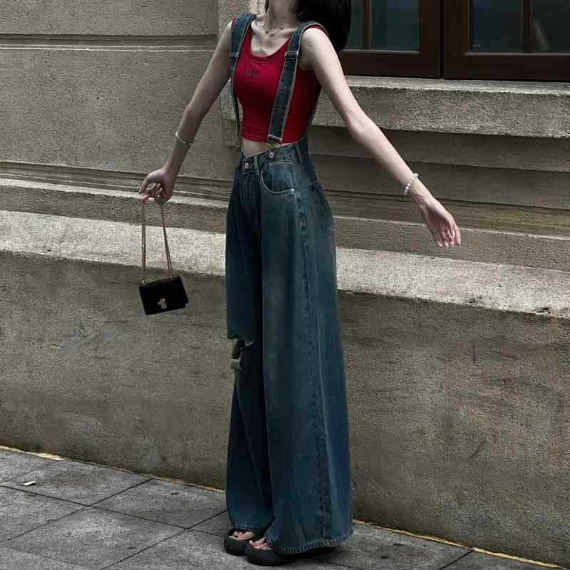 ファッション 服 オシャレ カワイイ シンプル 大カワイイ サイズ 婦服 デニム サスペンダー夏 ストレート レッグスリム ワイド レッグ フロア レングス パンツ