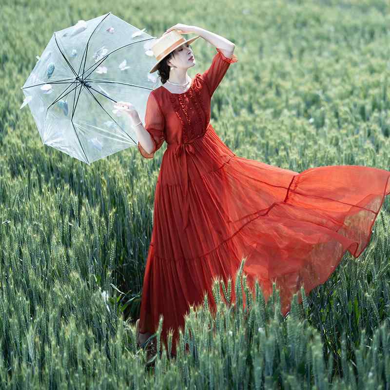 ワンピース 夏 エレガント ラウンドネック クラシック プルオーバー カジュアル レディース 薄手 七分袖 ロング 日常使い 大人かわいい