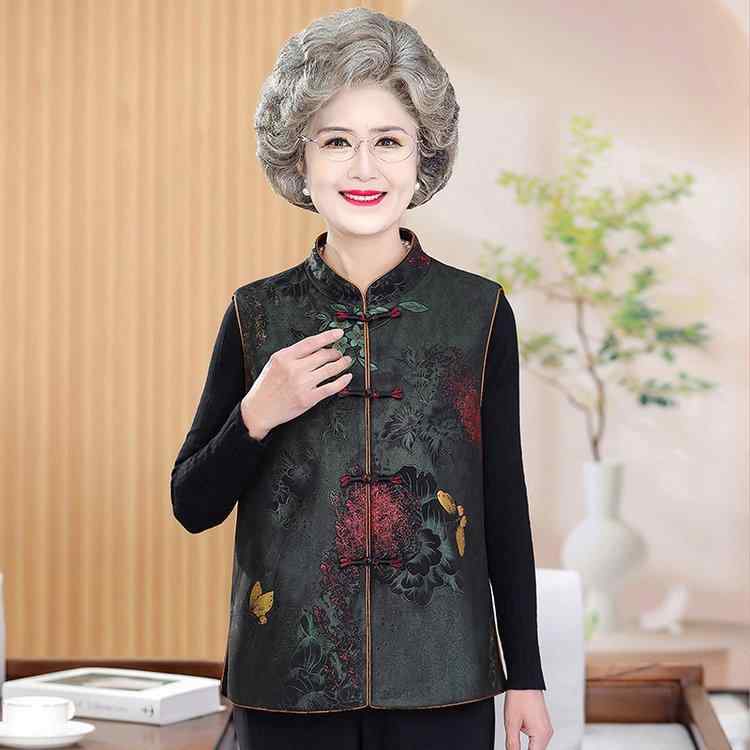 シニア レディース 春秋 ベスト ジャケット 復古 国風 花柄 通勤 ポケット 綿 ポリエステル ワインレッド ダークグリーン 上品 エスニック 普通丈