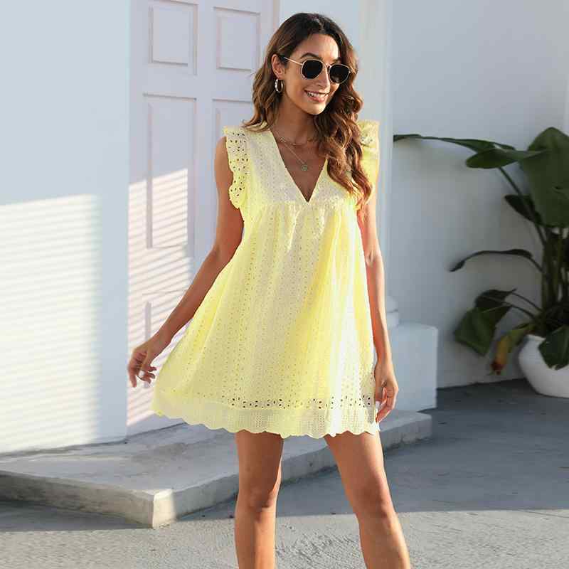 ワンピース レディース ノースリーブ Vネック Aライン 無地 膝丈 綿 提花 レース 切り替え フリル 欧美風 通勤 ホワイト ピンク イエロー オレンジ ワインレッド パープル ライトブルー ネイビー ブラック ライトグリーン マゼンタ グリーン X