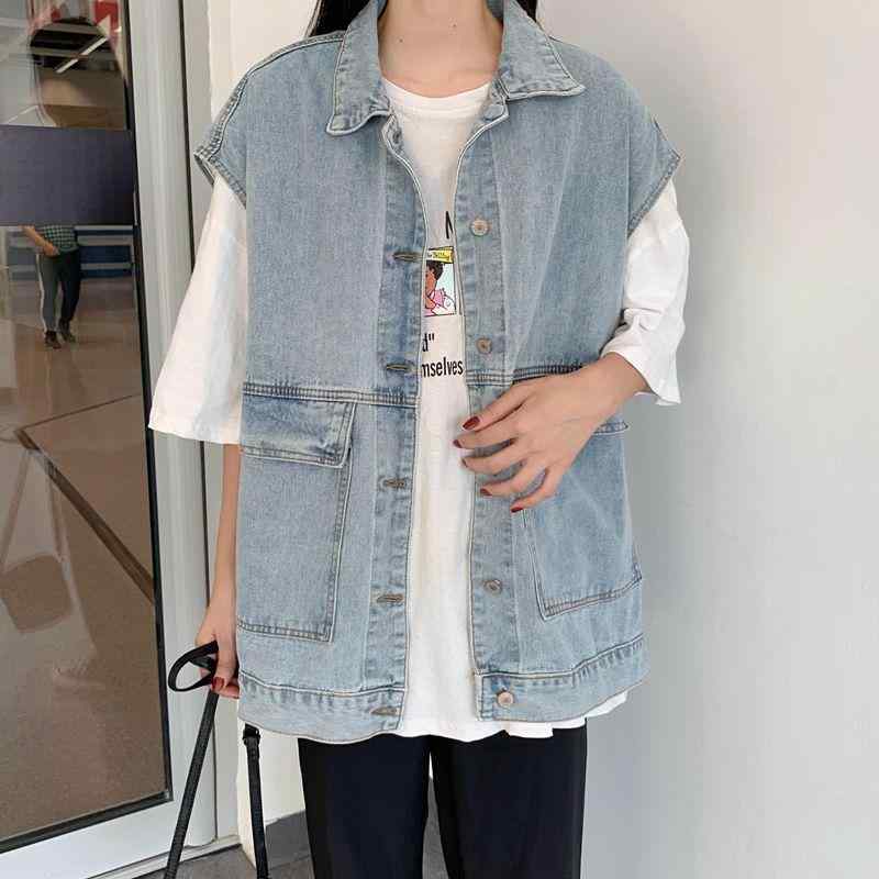 ベスト レディース 春秋 デニムベスト コットン ワークベスト 無地 ゆったり 襟付き カットソー ブラウス 通勤 通学 普段使い レイヤード アメカジ 抜け感 かわいい ブラック 黒 ブルー 青 グレー