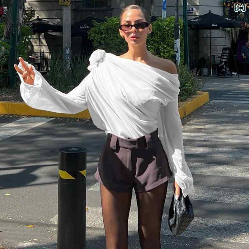 Tシャツ レディース 秋冬 セクシー カットソー 斜め肩 長袖 ポリエステル チュール スリムフィット 杏色 ブラック ホワイト グリーン 普段使い