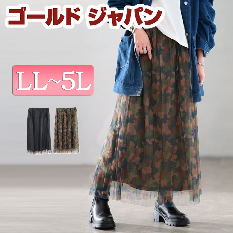 大きいサイズ レディース スカート ボトムス レイヤードチュールプリーツスカート ロングスカート プリーツスカート チュールスカート ロング チュール プリーツ ウエストゴム フレア カモフラ 柄 夏新作 夏服 秋服 春服 LL 2L 3L 4L 5L ブラック 黒 迷彩 ゴールドジャパン