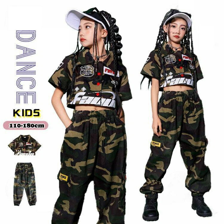 キッズダンス衣装 セットアップ ヒップホップ 迷彩セット ダンス衣装 パンツ 半袖シャツ ジャケット ダンス衣装 女の子 チーム衣装 舞台服 ヘソ出し キッズ ダンス 衣装 ヒップホップ ガールズ hiphop jazz ダンス衣装 カッコイイ 110-180cm