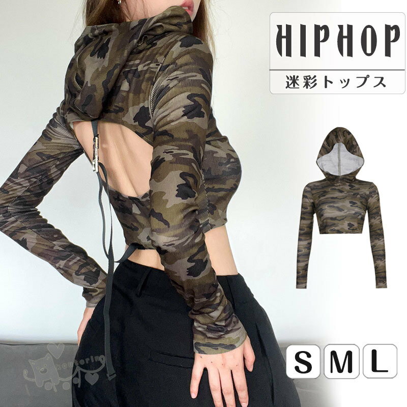 トップス 迷彩柄 トップス レディース 長袖 トップス Tシャツ 帽子付き へそ出し セクシー 原宿系 奇抜 派手 ダンス 衣装 ヒップホップ コスチューム 個性的 服 原宿系 送料無料