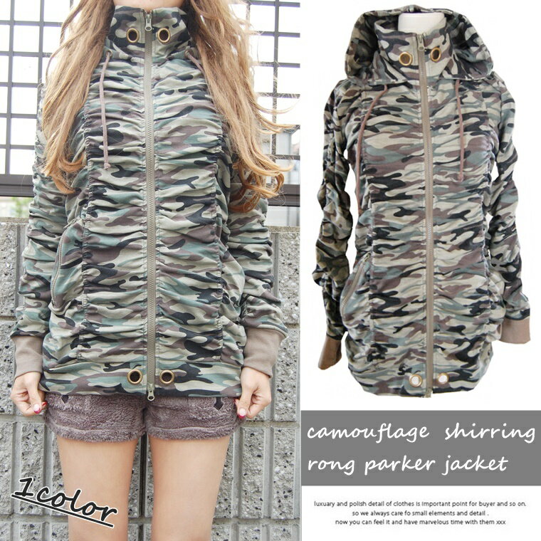 フード付きカモフラージュ柄ロングシャーリングジップアップ長袖パーカー1色/迷彩/アウター/迷彩/カーキ/ミリタリー/アーミー/総柄/ジャケット/レディース/ユニセックス/メンズ/男女兼用/スタンドカラー/ハイネック【ネコポス不可】