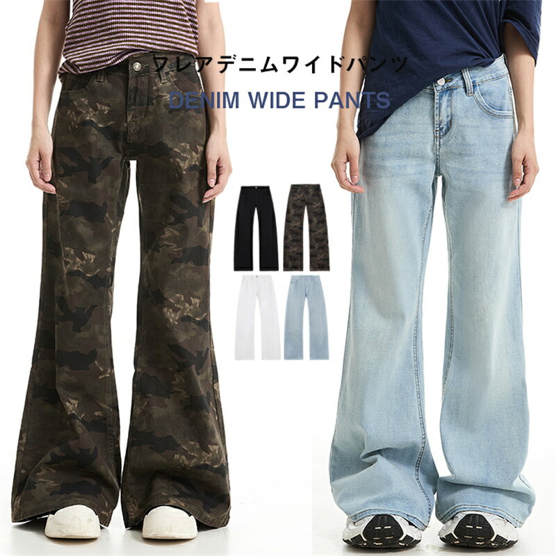 デニム フレアンツ レディース デニムパンツ ワイドパンツ バギーパンツ ジーンズ ジーパン ボトム 体型カバー ボトムス ハイウエスト ズボン フレア パンツ 小さい 大きいサイズ 無地 迷彩 春 夏