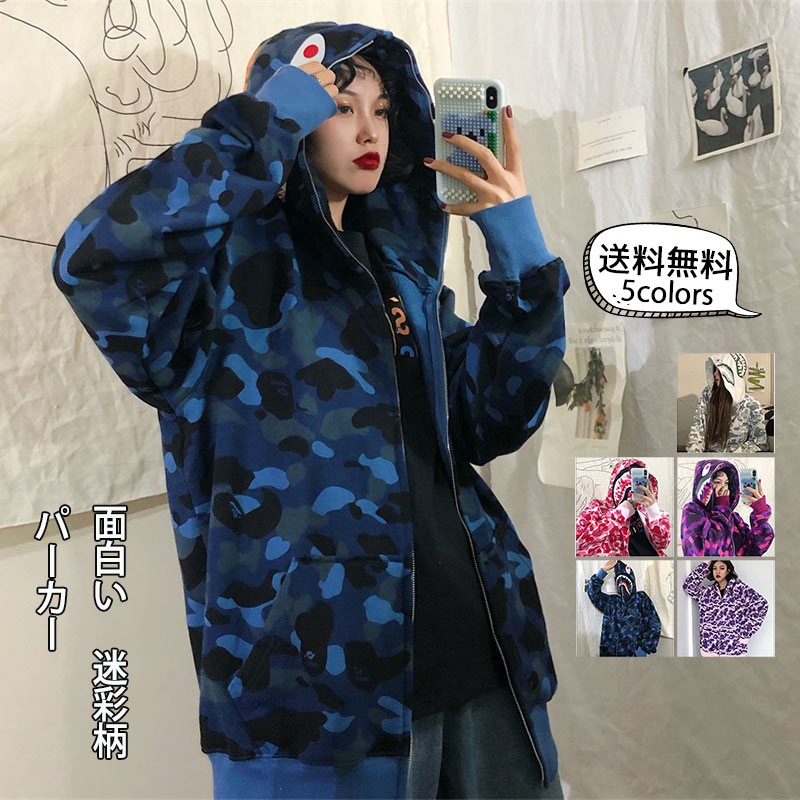 \ブラックフライデークーポンあり/ジップアップパーカー レディース パーカー トレーナー メンズ 長袖 薄手 迷彩柄 カモフラ サメ柄 面白い フード付き カップル ペアルック スポーツ カジュアル 春秋 トップス アウター きれいめ おしゃれ 送料無料