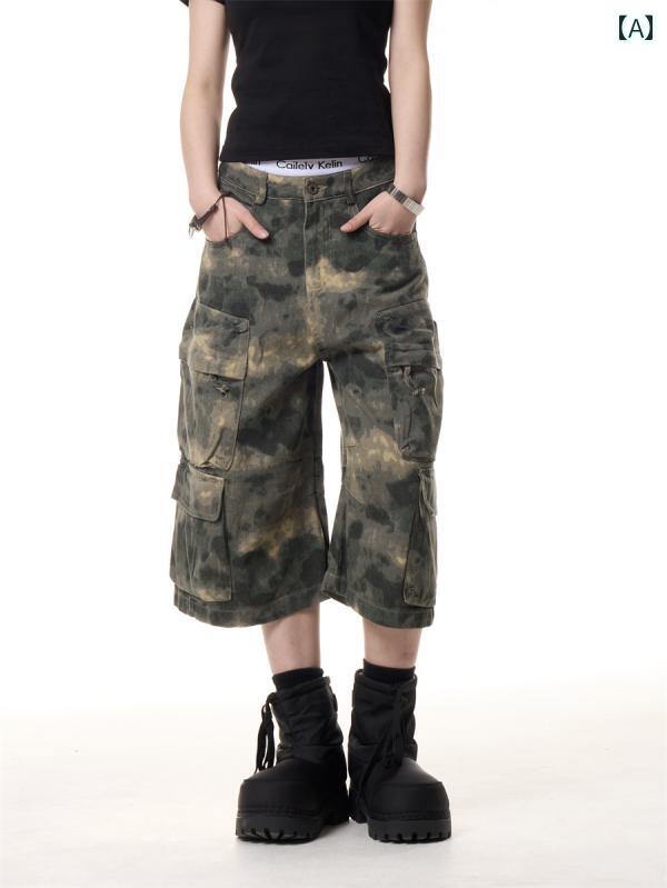 パンツ 七分丈 レディース 迷彩 アメリカン レトロ 夏 ワイドレッグ ストレート ヴィンテージ クロップド カジュアル ミリタリー モダン