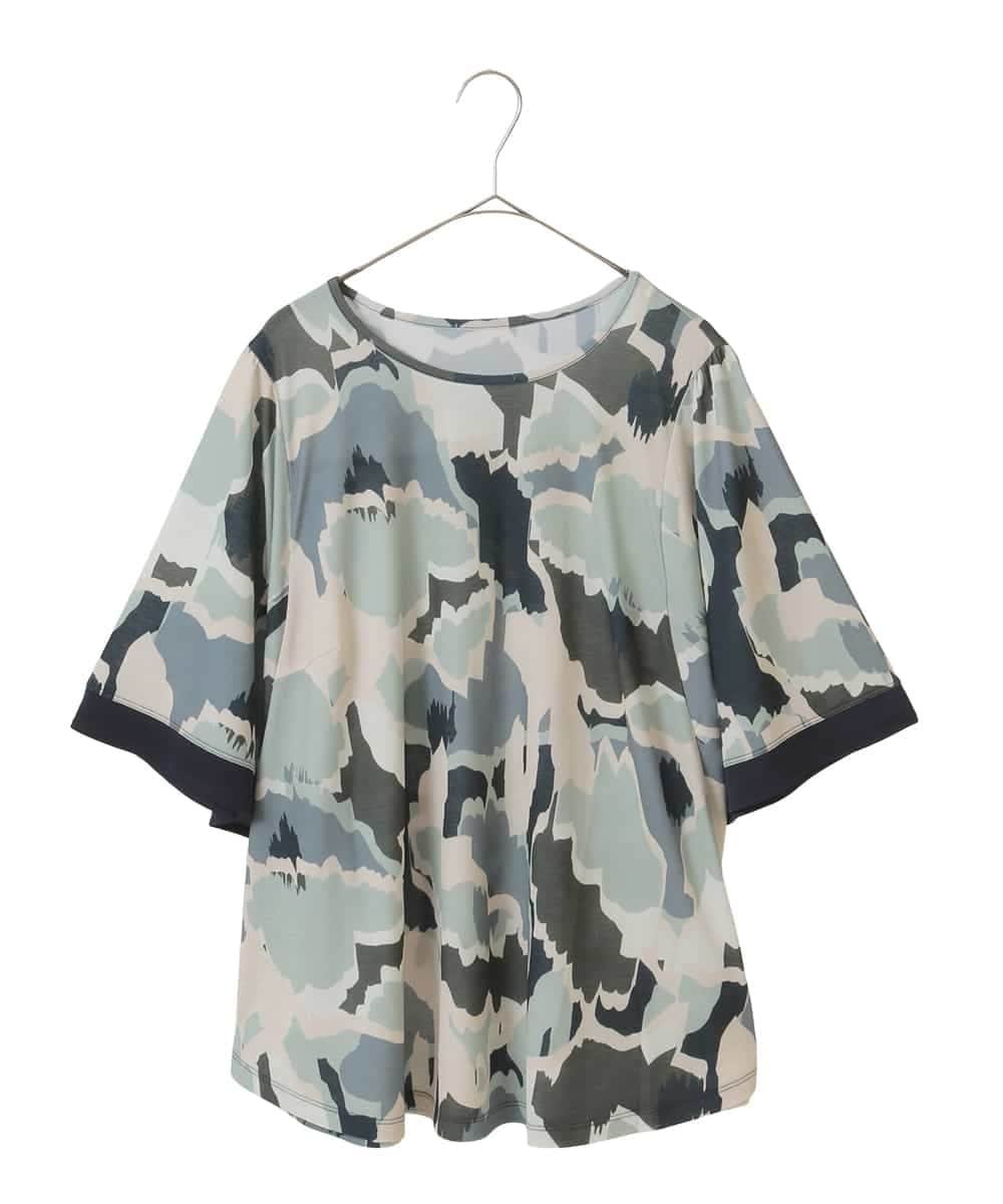 HIROKO BIS GRANDE 【大きいサイズ】迷彩フラワーフレアスリーブカットソー /洗濯機で洗える ヒロコ ビス グランデ トップス カットソー・Tシャツ グリーン【送料無料】