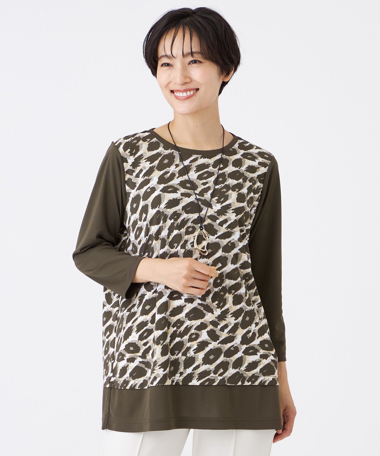 EVEX by KRIZIA(エヴェックス バイ クリツィア)【接触冷感】【UV対策】【マシンウォッシャブル】カモフラパンサーチュニックカットソー【接触冷感】【UV対策】【マシンウォッシャブル】カモフラパンサーチュニックカットソー肩はコンパクトなセットイン、身頃はボクシーなシルエットが大人カジュアルな七分袖カットソー。袖と裾に無地素材をコンビすることで、ぬけ感をプラスしました。【素材】肌離れの良い、サラッと着られる強撚スムース素材を使用。プリントの柄は、パンサーをカモフラ風にアレンジしました。接触冷感機能と、紫外線遮蔽機能(紫外線遮蔽率86%以上)付きで、夏にぴったりの素材です。(春夏展開商材)身長163B77W56H87着用サイズ:40型番:U5P45612---75-40 PV5991【採寸】サイズ総丈肩幅バスト袖丈裄丈4270cm39cm109cm47cm66.5cm4069cm38cm106cm46cm65cm商品のサイズについて【商品詳細】日本製素材:ポリエステル100%サイズ:40、42※画面上と実物では多少色具合が異なって見える場合もございます。ご了承ください。商品のカラーについて 【予約商品について】 ※「先行予約販売中」「予約販売中」をご注文の際は予約商品についてをご確認ください。■重要なお知らせ※ 当店では、ギフト配送サービス及びラッピングサービスを行っておりません。ラッピング・ギフト配送について同時に複数の商品を注文された場合メーカー希望小売価格についてご利用ガイドEVEX by KRIZIA(エヴェックス バイ クリツィア)【接触冷感】【UV対策】【マシンウォッシャブル】カモフラパンサーチュニックカットソー【接触冷感】【UV対策】【マシンウォッシャブル】カモフラパンサーチュニックカットソー肩はコンパクトなセットイン、身頃はボクシーなシルエットが大人カジュアルな七分袖カットソー。袖と裾に無地素材をコンビすることで、ぬけ感をプラスしました。【素材】肌離れの良い、サラッと着られる強撚スムース素材を使用。プリントの柄は、パンサーをカモフラ風にアレンジしました。接触冷感機能と、紫外線遮蔽機能(紫外線遮蔽率86%以上)付きで、夏にぴったりの素材です。(春夏展開商材)身長163B77W56H87着用サイズ:40型番:U5P45612---75-40 PV5991【採寸】サイズ総丈肩幅バスト袖丈裄丈4270cm39cm109cm47cm66.5cm4069cm38cm106cm46cm65cm商品のサイズについて【商品詳細】日本製素材:ポリエステル100%サイズ:40、42※画面上と実物では多少色具合が異なって見える場合もございます。ご了承ください。商品のカラーについて
