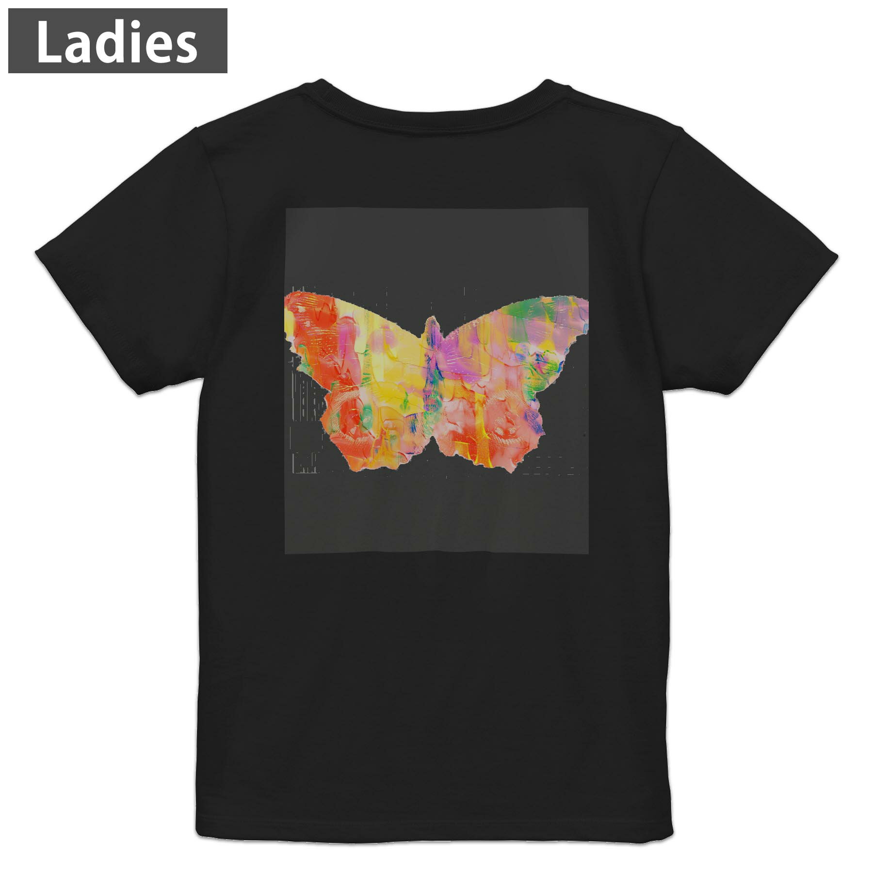 Tシャツ レディース バックプリント 半袖 ブラック 黒 デザイン M L tシャツ ティーシャツ T shirt 026258 蝶々 カラフル 絵具