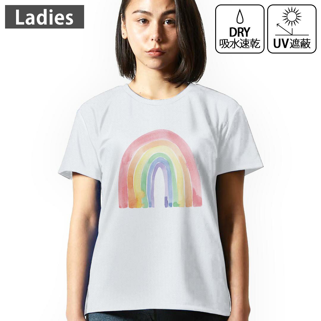 レディース ドライTシャツ ホワイト 半袖 4.1オンス ジム トレーニング スポーツ 運動会 ドライアスレチック UVカット 紫外線遮蔽 吸水速乾 デザイン Tshirt M L 031716 虹 カラフル 絵具