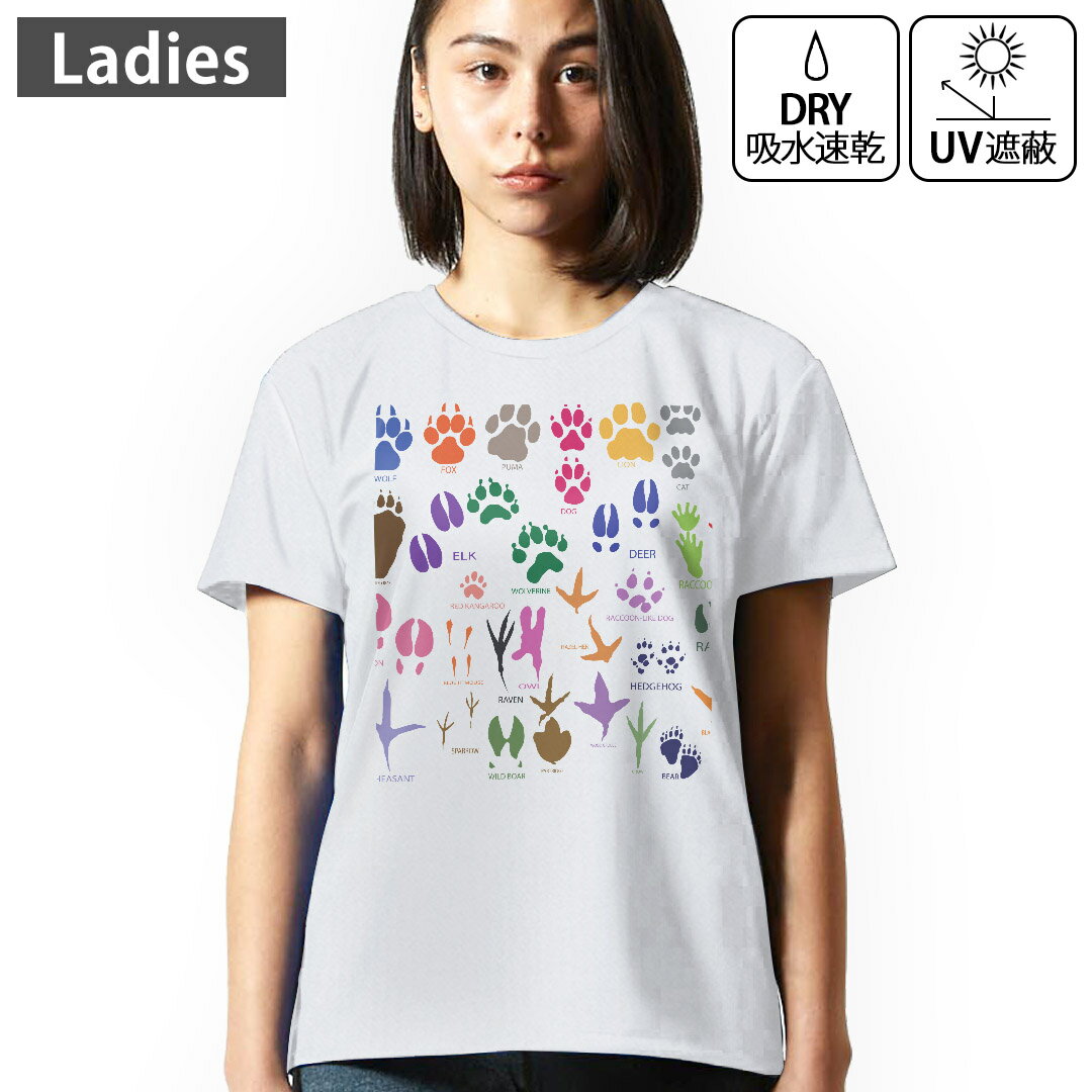 レディース ドライTシャツ ホワイト 半袖 4.1オンス ジム トレーニング スポーツ 運動会 ドライアスレチック UVカット 紫外線遮蔽 吸水速乾 デザイン Tshirt M L ユニーク 動物 足跡 カラフル 007566
