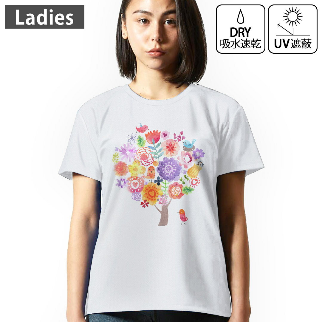 レディース ドライTシャツ ホワイト 半袖 4.1オンス ジム トレーニング スポーツ 運動会 ドライアスレチック UVカット 紫外線遮蔽 吸水速乾 デザイン Tshirt M L フラワー 鳥 カラフル 009645