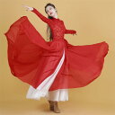 舞踊服 レディース 古典舞 演出服 軽やか 華やか 大紅色 クリムゾン レッド フレアスカート ロング丈 二層 舞台衣装 発表会 イベント パフォーマンスウェア 練習着 チェニール スパンデックス 綿混 エレガント 優雅 ダンスウェア