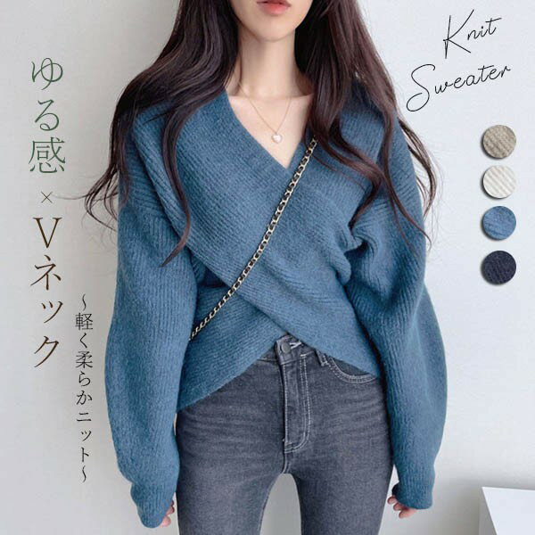 Vネックセーター レディース ニットセーター オフショルダー オフショルニット 春秋 長袖 ドロップショルダー 大人 バルーン袖 フェミニン 可愛い ざっくり編み リブニット ショート丈 ゆったり 秋冬 韓国風 ベージュ オフホワイト ブルー ブラック eh080x1x1c6