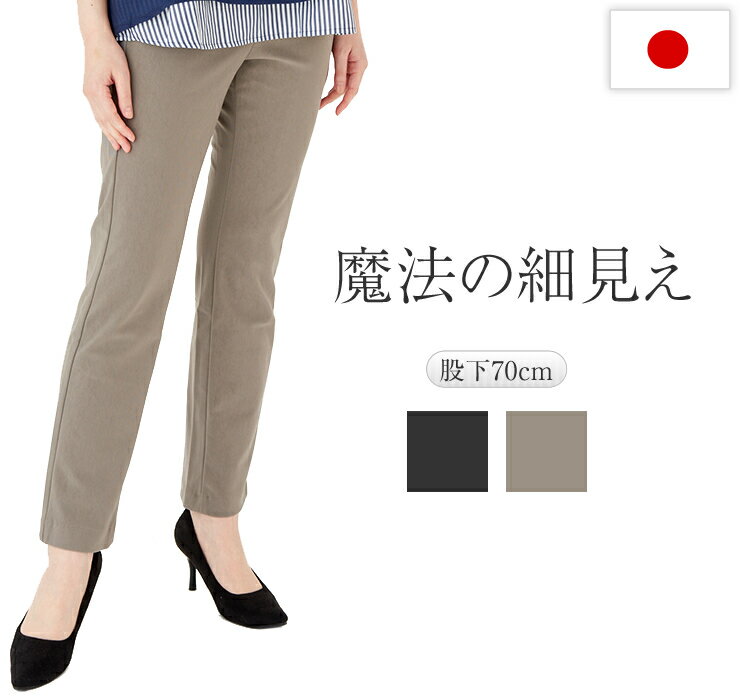 細見せパンツ 3Dパンツ レディース 【 視覚効果でスリムな印象になる レディースパンツ プルオンパンツ ハイテンションパンツ 日本製 ロングパンツ スラックス 股下70 ブラック 黒 グレー 股上深い skinny pants 】