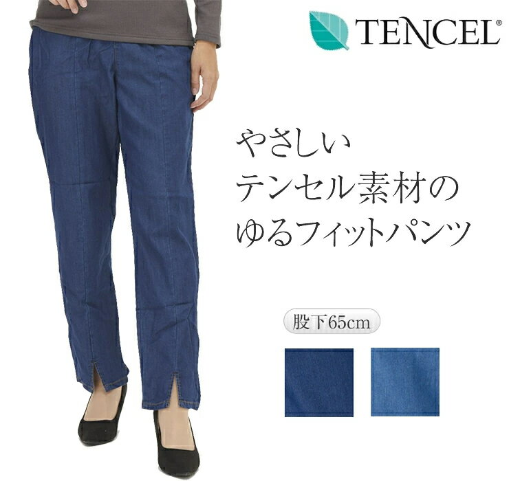 やさしい ゆったり パンツ テンセル デニム レディース 【 カジュアルパンツ ヒップアップ ハイウエスト ゴムズボン レディースパンツ ズボン ゴムパンツ 体型カバー ウエストゴム ワイド テンセル70% 股下65 ネイビー フェード 】