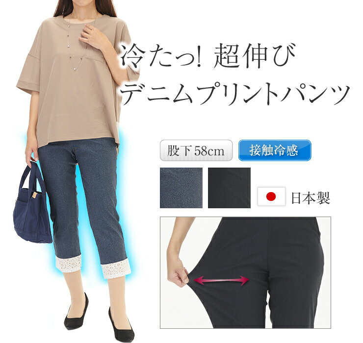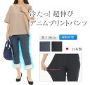 冷たい素材の デニムプリント パンツ 夏 日本製 接触冷感パンツ 冷感パンツ ストレッチデニム ジーンズ ウエストゴムパンツ ブラック 黒 ネイビー 紺 股下58 クロップド丈 クロップドパンツ 7分丈パンツ 夏パンツ 大人 プリントパンツ 股上深め 伸びる 涼しい 夏用