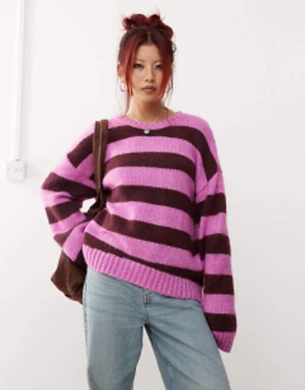 モンキ レディース アウター ニット・セーター クルーネック セーター ニット Monki crew neck knit sweater and burgundy stripe PINK AND BURGUNDY バーガンディ