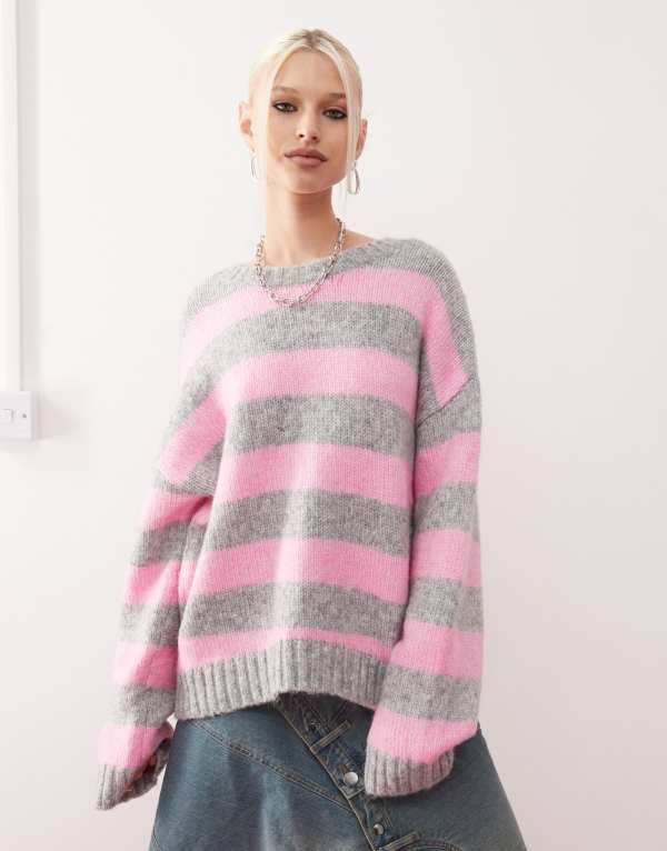 モンキ レディース アウター ニット・セーター クルーネック セーター ニット Monki crew neck knit sweater and gray stripe Pink and gray グレー