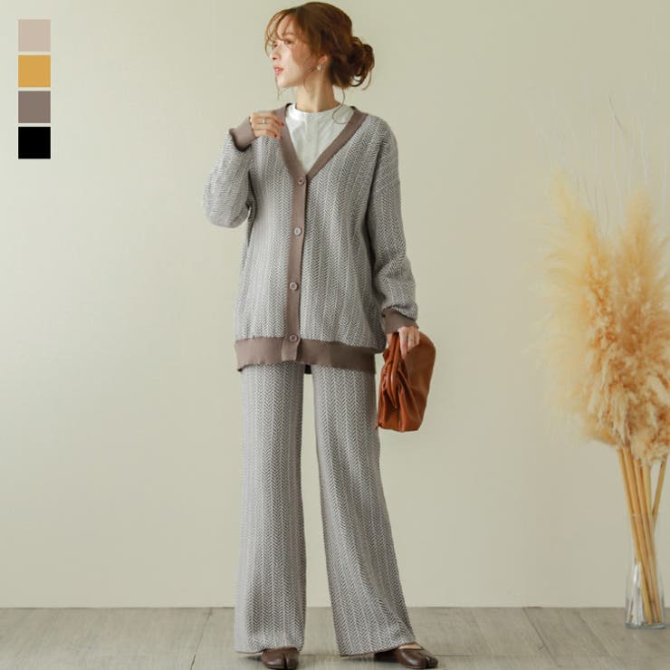 【10%OFFクーポン!11/27(木)1:59まで】La-gemme ヘリンボーン柄 ニットカーディガン レディース Vネック トップス ニット カーデ 羽織 ミディアム丈 ゆったり 体型カバー ドロップショルダー おしゃれ 可愛い トレンド ブラック