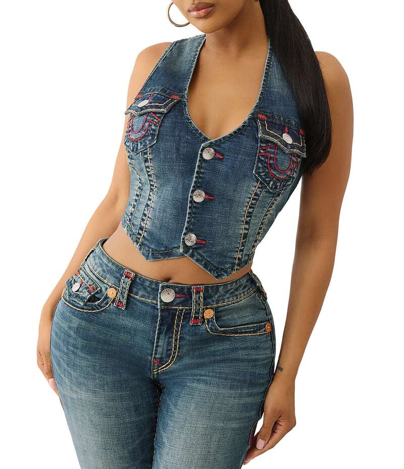 トゥルーレリジョン レディース アウター ベスト Vネック ノースリーブ デニム True Religion Super T Plunging V-Neck Sleeveless Denim Vest Twilight Spark デニム