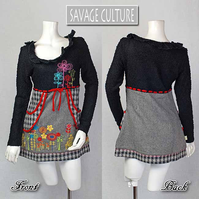 "SAVAGE CULTURE" バイヤーIKUKOお薦め! 襟のフリルとフラワー刺繍が可愛いセーター サイズSとM 【ウール混】 正面・背面画像 ブラックのニット生地と100%ウール生地で切替えたロング丈セーター。 裾に施された可愛いフラワー刺繍がポイント。 切替部分やポケット部分にあしらわれたレッドのニット紐ステッチがアクセント。 左ファスナー仕上げ。 撮影用トルソーはサイズSを着用。 Size 【表示サイズ】サイズSとM。 【サイズS実寸】バスト約78cm、ハイウエスト切替部分約68cm、肩幅約35.5cm、袖丈約61cm、アーム幅約21.5cm×2、着丈約70.5cm。 【サイズM実寸】バスト約80cm、ハイウエスト切替部分約71cm、肩幅約37cm、袖丈約62cm、アーム幅約22cm×2、着丈約72cm。 ブラック生地のみ少し伸縮性あり。ブラック生地部分以外裏地あり。透け感なし。ニットのチクチク感なし。フィット感あり。 【重さ】約380g(サイズS。) ★一着ごとにメジャーで採寸しておりますので、若干の誤差が出る可能性がございます。 目安としてご理解ください。採寸の方法についてはこちらをご覧ください。 Color グレー、ブラック。刺繍: レッド、イエロー、黄緑、オレンジ、ブルー、ピンク。 ★画像については本来の色が表示されるよう調整しておりますが、お客様のご覧になる機器により若干違って見えることがあります。ご了承ください。 トルソーサイズ 黒トルソー: 9号 バスト81.5cm、ウエスト59.5cm、ヒップ87cm。9号 バスト82cm、ウエスト55cm、ヒップ81cm。 足付きトルソー: 9号 バスト82cm、ウエスト58cm、ヒップ84cm、身長は約170cm(頭付きとした場合)。 材 質 【材質】50% ACRYLIC、30% POLYESTER、20% WOOL。 インド製。"SAVAGE CULTURE"はスペインのメーカーです。 その他